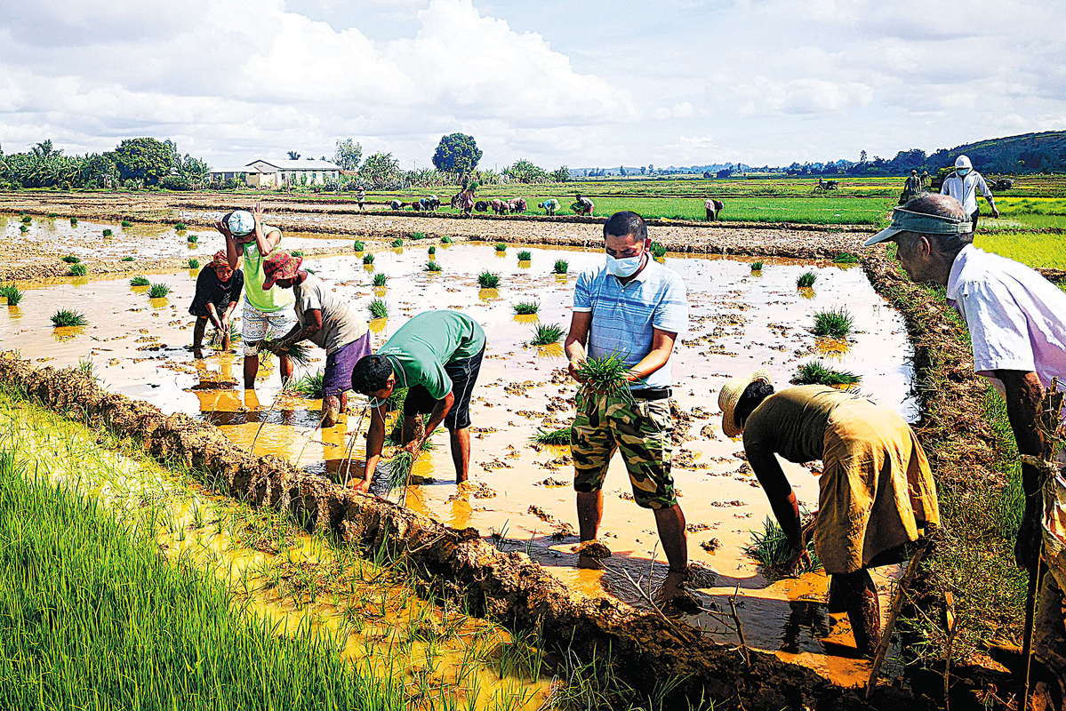 Chinese expert Yang Yaoxi (center) plants rice seedlings with farmers in Madagascar in January last year. [Photo/China Daily]