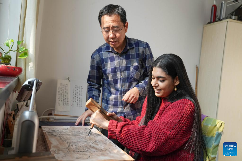 Gurmehar Singh learns how to create Yangliuqing woodblock prints under the instruction of artist Liu Jie in north China's Tianjin, Nov. 17, 2022. (Xinhua/Sun Fanyue)