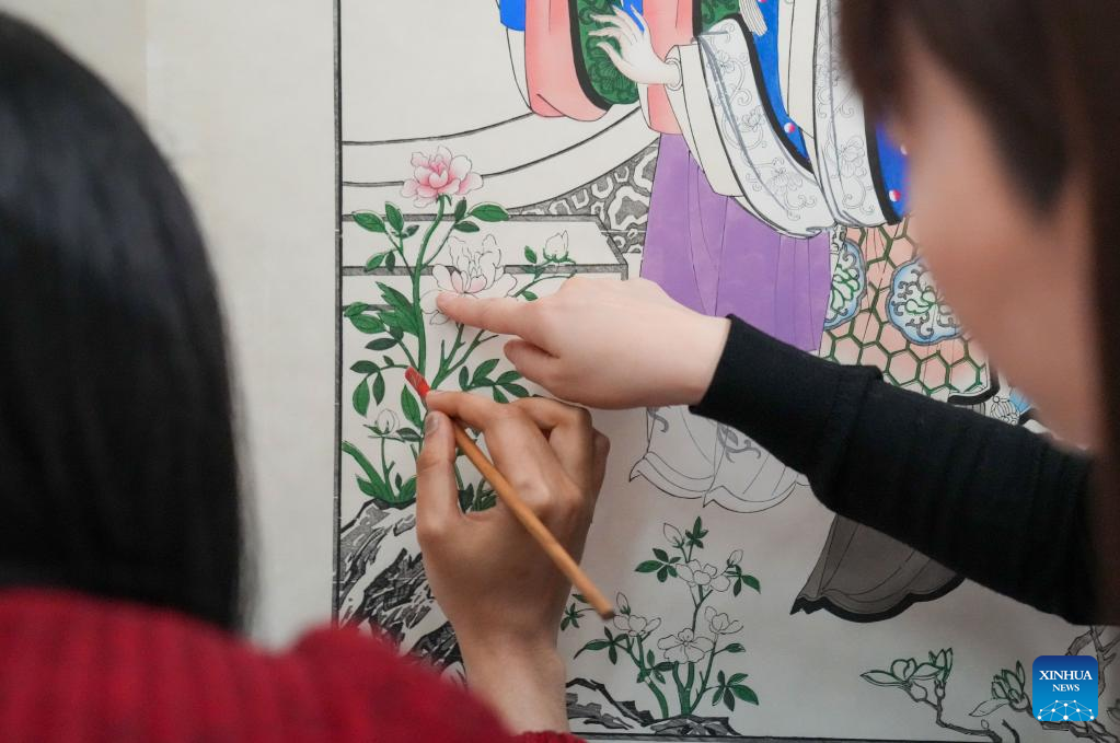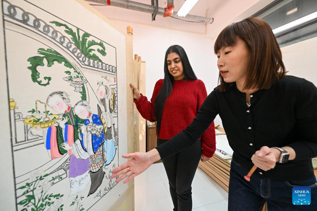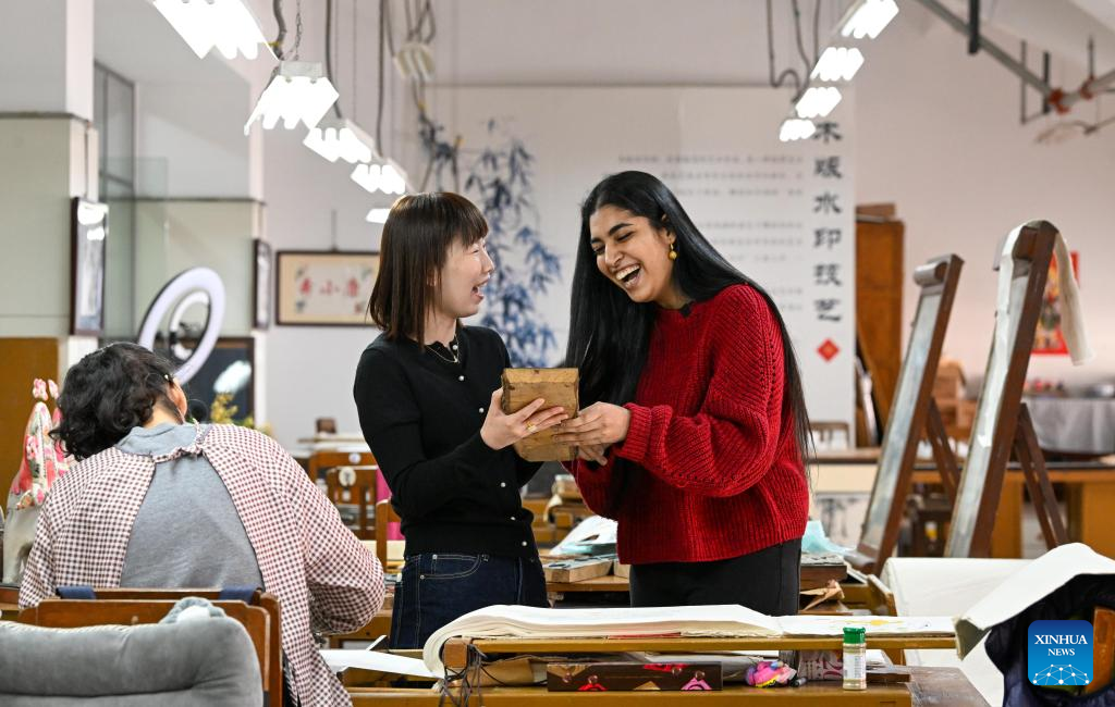 Gurmehar Singh learns from artist Wang Yan (R) about how to create Yangliuqing woodblock prints in north China's Tianjin, Nov. 17, 2022. (Xinhua/Li Ran)