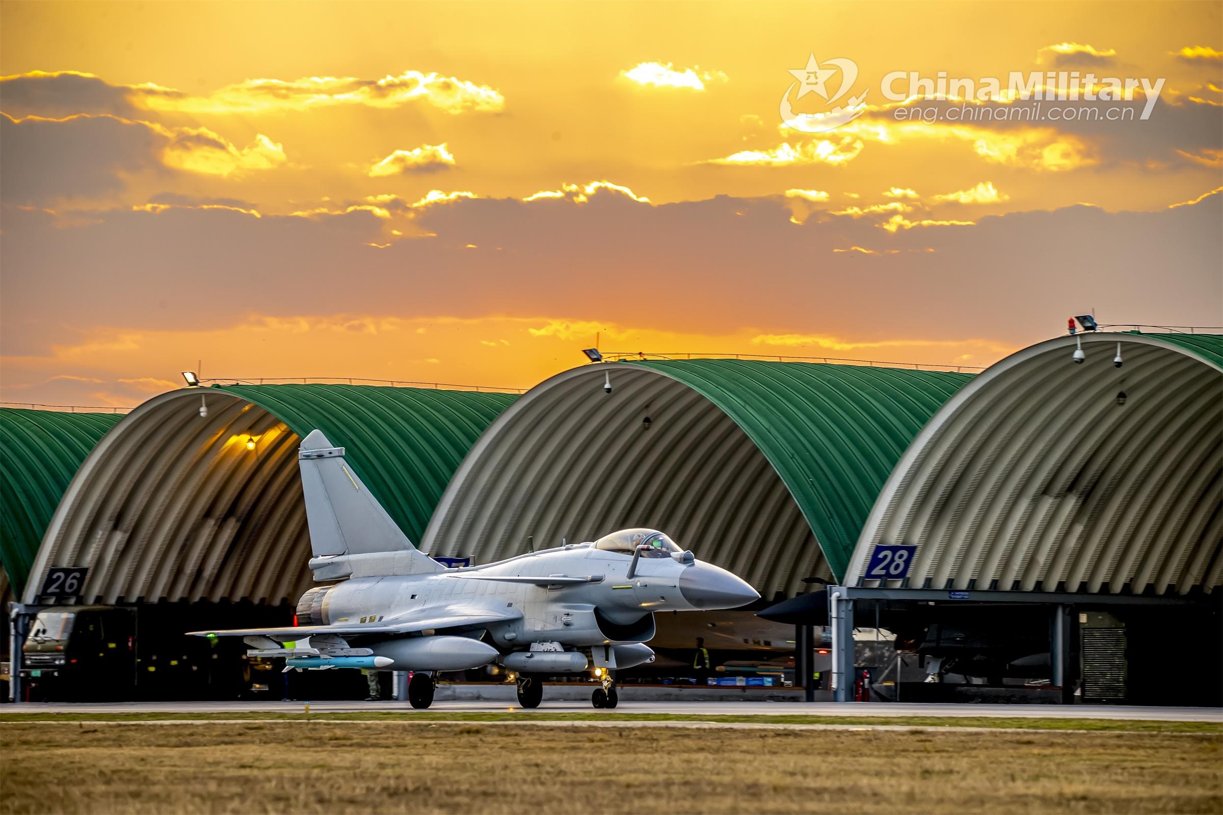 Fighter jets attached to an aviation brigade of the air force under the PLA Southern Theater Command taxi out of the hangers successively in sunset prior to a round-the-clock flight training mission on November 8, 2022. (eng.chinamil.com.cn/Photo by Wang Guoyun)