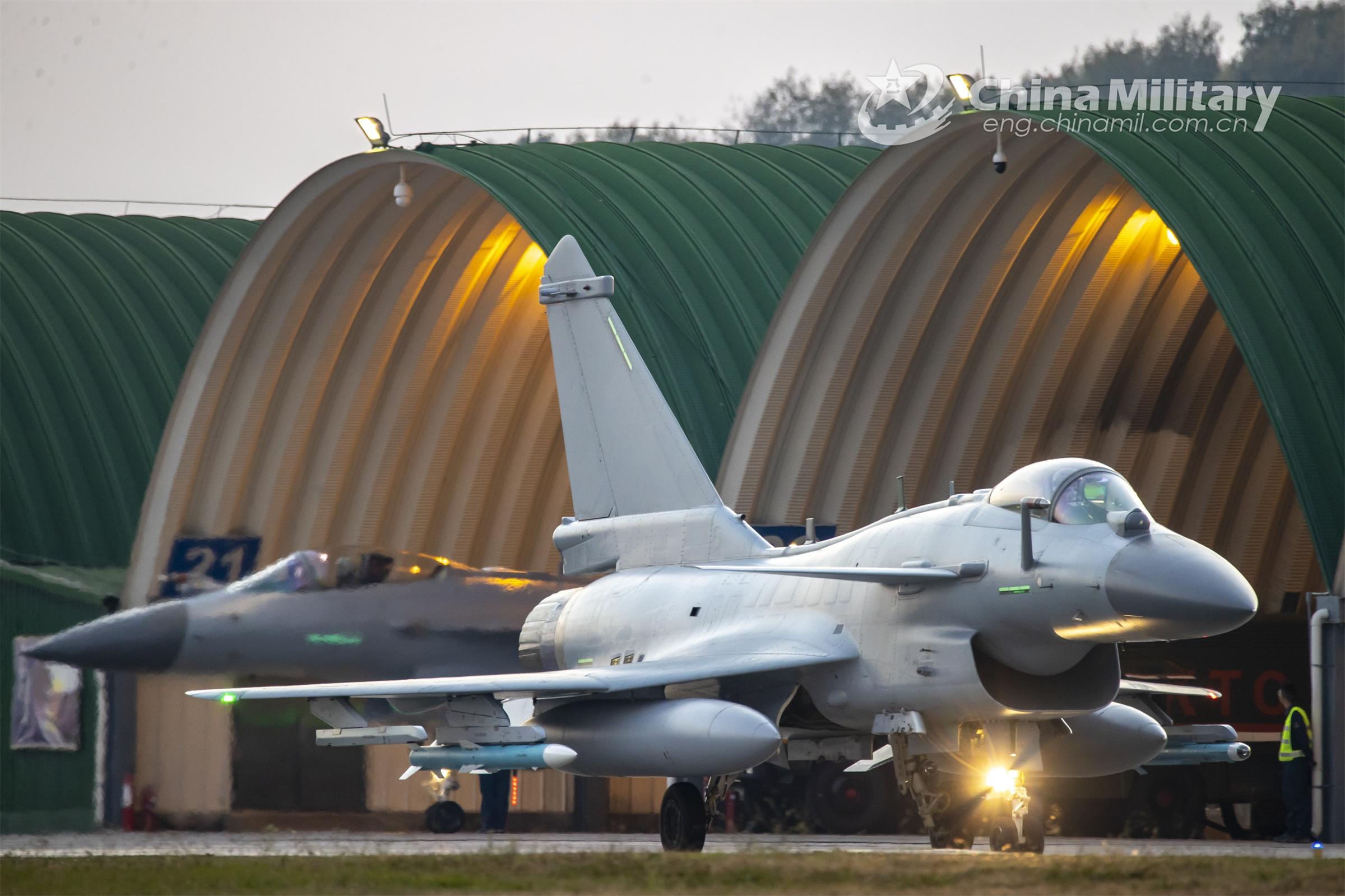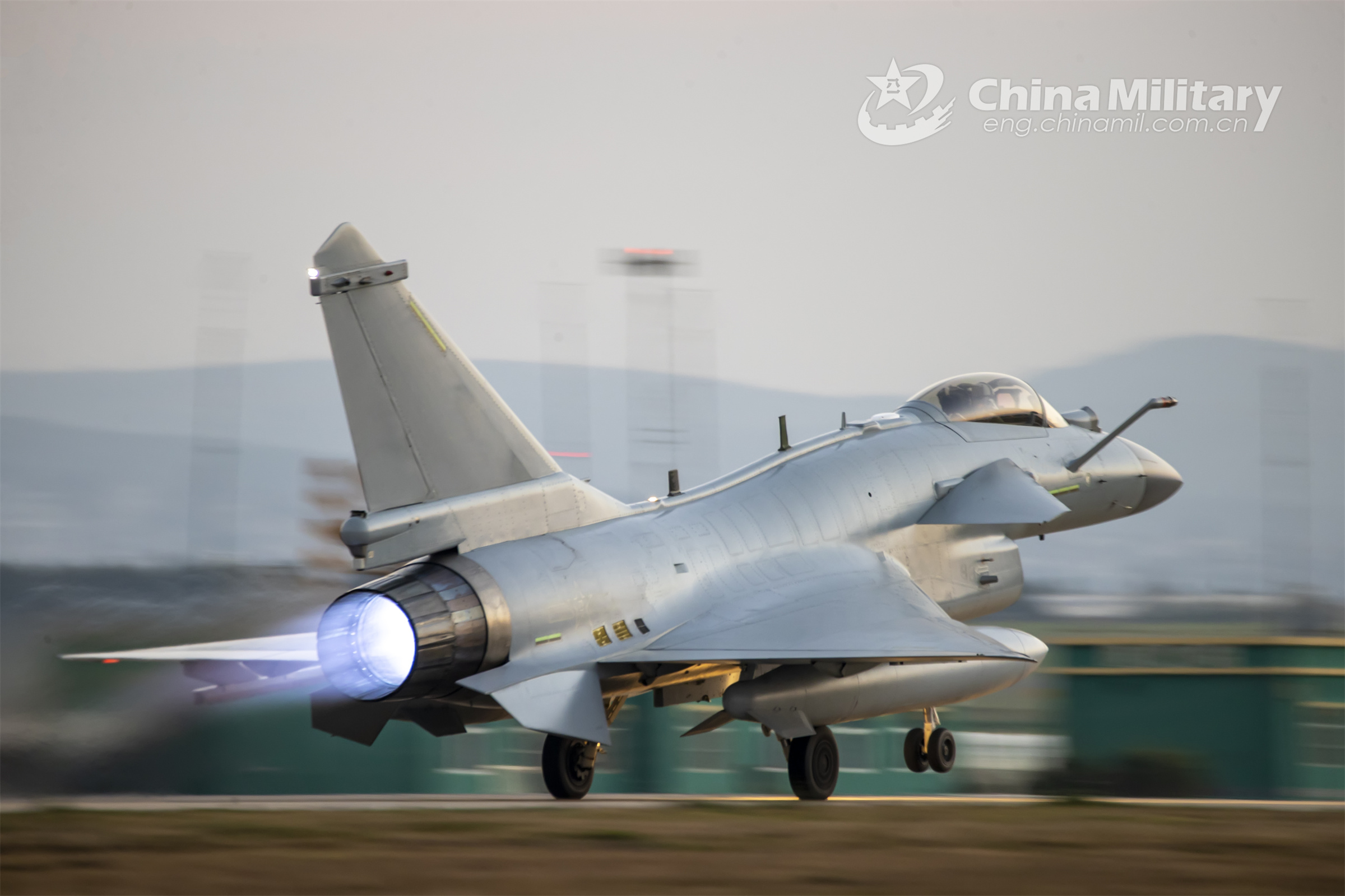 A J-10 fighter jet attached to an aviation brigade of the air force under the PLA Southern Theater Command takes off for a round-the-clock flight training mission on November 8, 2022. (eng.chinamil.com.cn/Photo by Wang Guoyun)