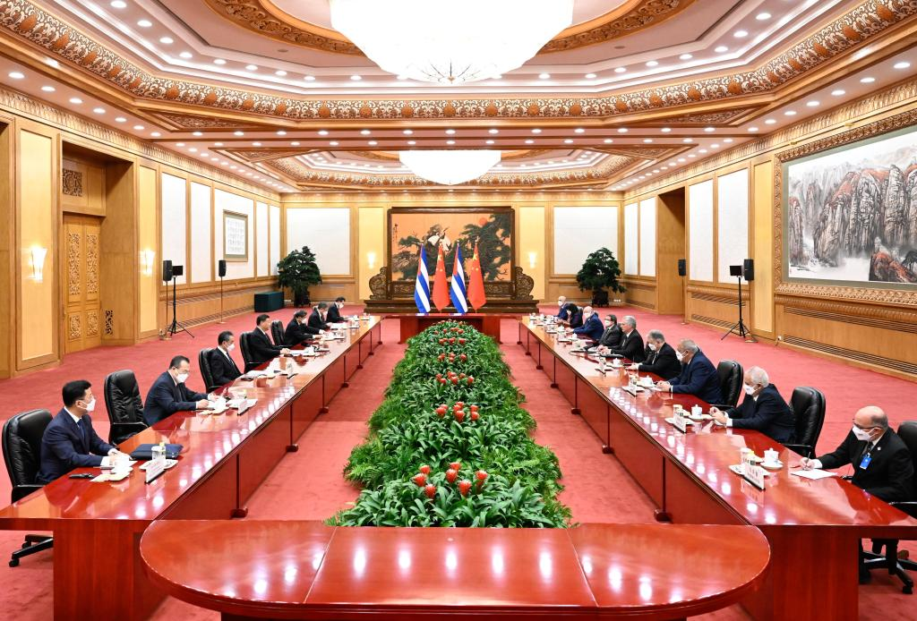 Xi Jinping, general secretary of the Communist Party of China (CPC) Central Committee and Chinese president, holds talks with Miguel Diaz-Canel Bermudez, first secretary of the Central Committee of the Communist Party of Cuba and Cuban president, at the Great Hall of the People in Beijing, capital of China, Nov. 25, 2022. (Xinhua/Shen Hong)