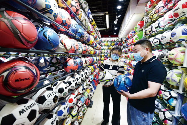 Consumers select products related to the World Cup at the Yiwu International Trade City in Yiwu, east China’s Zhejiang Province on Sept. 22, 2022. (Photo/Jinhua Daily)