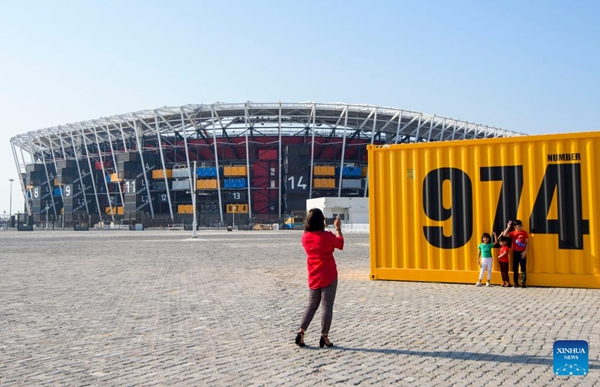 People take photos in front of the Stadium 974, a host venue for the Qatar 2022 FIFA World Cup in Doha, Qatar, on Oct. 7, 2022. (Photo by Nikku/Xinhua)