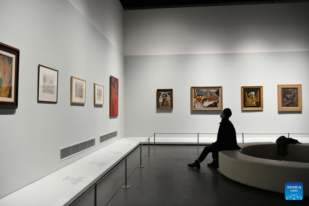 A visitor views exhibits at an exhibition of modern and contemporary European artworks in Chengdu Museum in Chengdu, southwest China's Sichuan Province, Nov. 25, 2022. An exhibition of modern and contemporary European artworks kicked off Friday in the southwestern Chinese city of Chengdu.(Xinhua/Tang Wenhao)