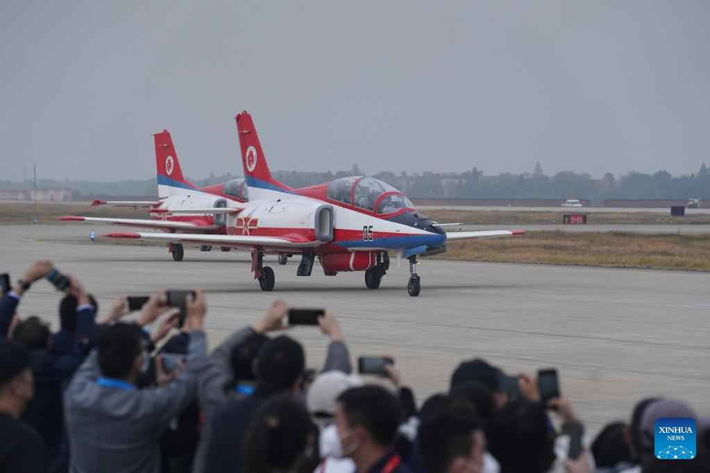 Aircraft from the Hongying aerobatic team taxi past visitors after performing at the Nanchang Air Show in Nanchang, east China's Jiangxi Province, Nov. 25, 2022. The 2022 China Aviation Industry Conference and Nanchang Air Show kicked off here on Friday. (Xinhua/Zhou Mi)