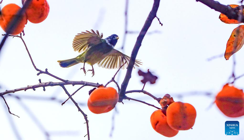 A bird forages near a persimmon tree at Zuiyang Village in Jiangyang District of Luzhou, southwest China's Sichuan Province, Nov. 27, 2022. (Photo by Liu Xueyi/Xinhua)