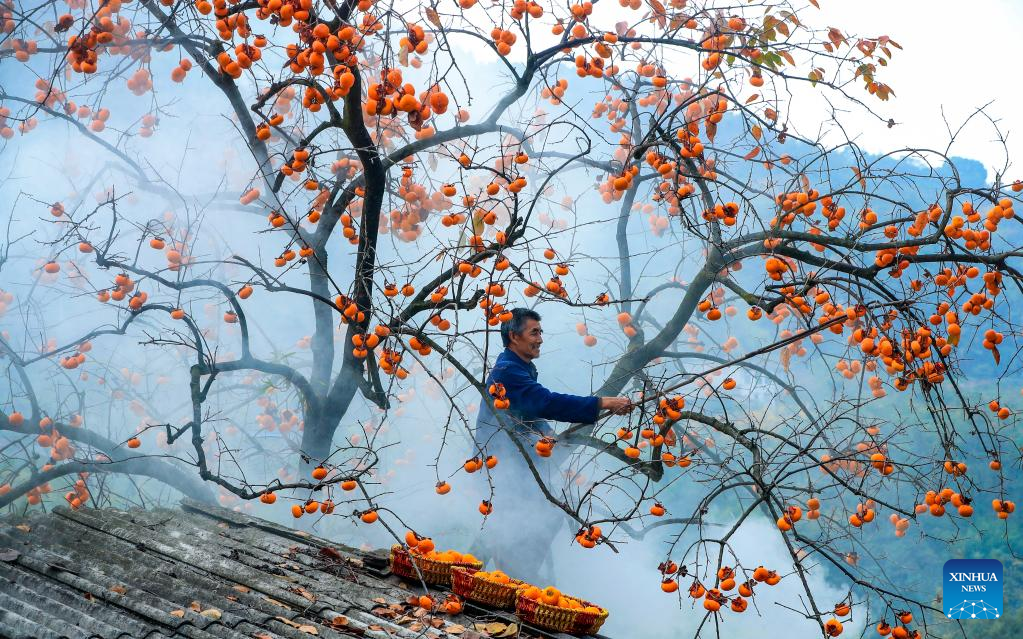 A villager picks persimmons at Zuiyang Village in Jiangyang District of Luzhou, southwest China's Sichuan Province, Nov. 27, 2022. (Photo by Liu Xueyi/Xinhua)