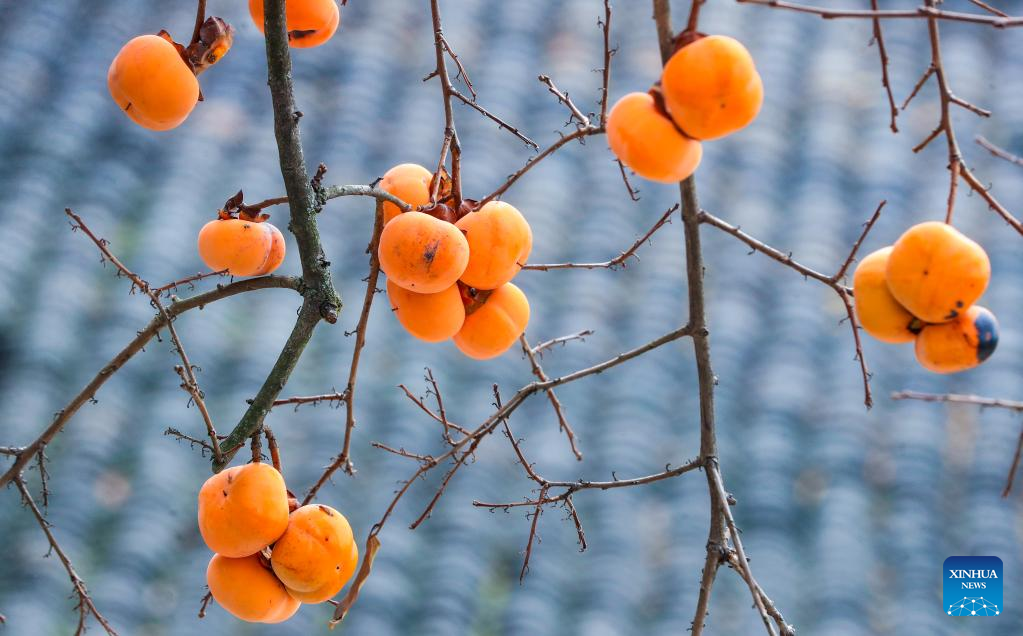 This photo taken on Nov. 27, 2022 shows persimmons on a tree at Zuiyang Village in Jiangyang District of Luzhou, southwest China's Sichuan Province. (Photo by Liu Xueyi/Xinhua)
