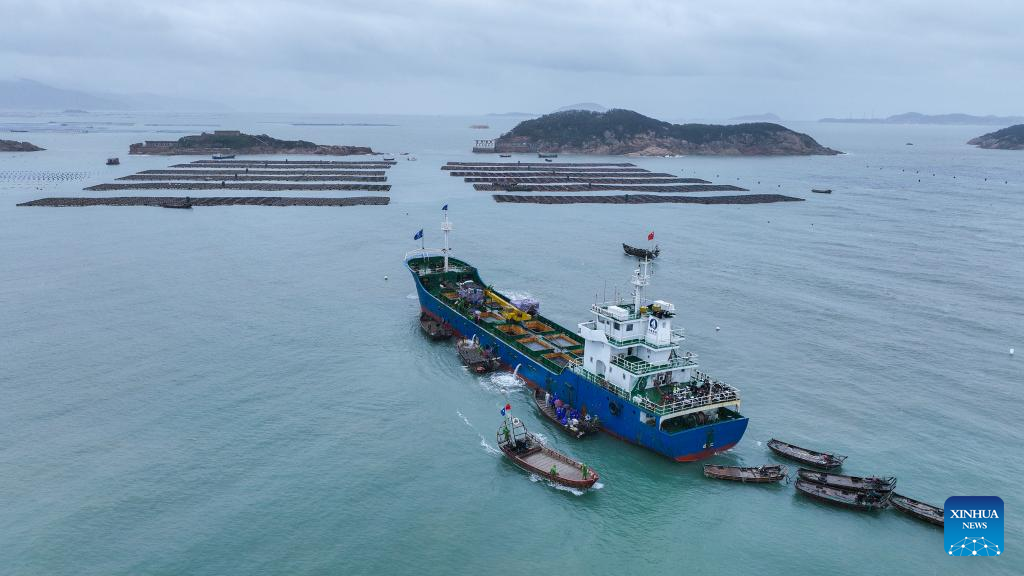 This aerial photo taken on Nov. 25, 2022 shows a transport vessel carring abalones on the waters of Lianjiang County, southeast China's Fujian Province. (Xinhua/Zhou Yi)