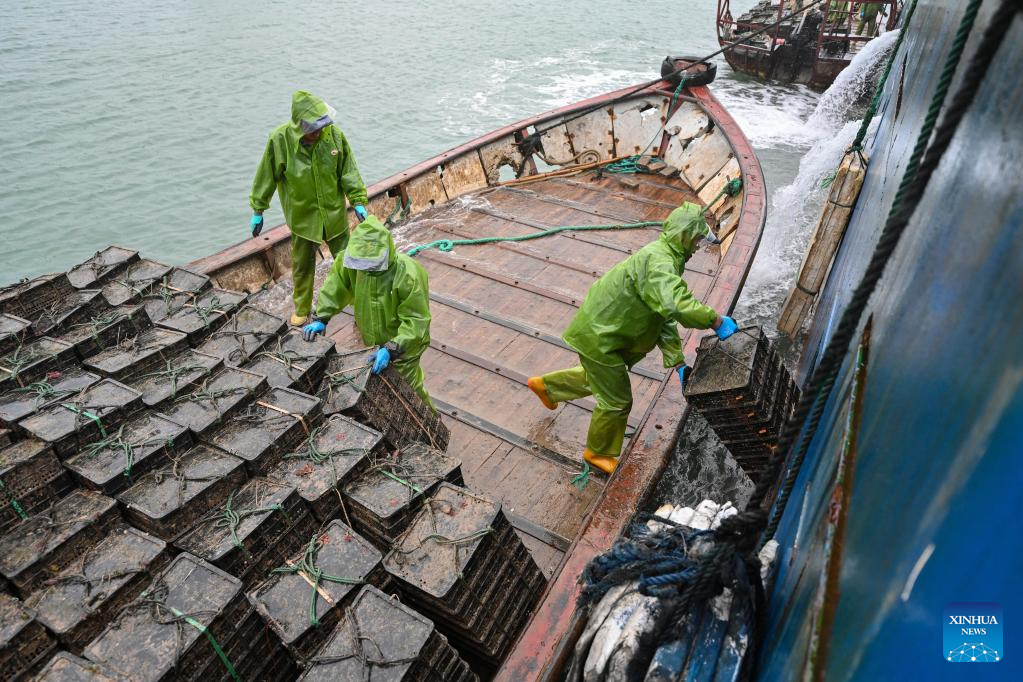 Fishermen transfer abalones from transport vessels to a breeding base in Lianjiang County of southeast China's Fujian Province, Nov. 25, 2022. (Xinhua/Zhou Yi)