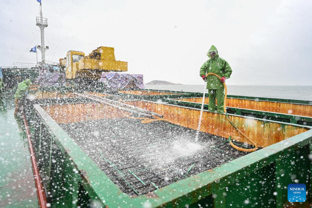 A fisherman works on a transport vessel on the waters of Lianjiang County, southeast China's Fujian Province, Nov. 25, 2022. (Xinhua/Zhou Yi)