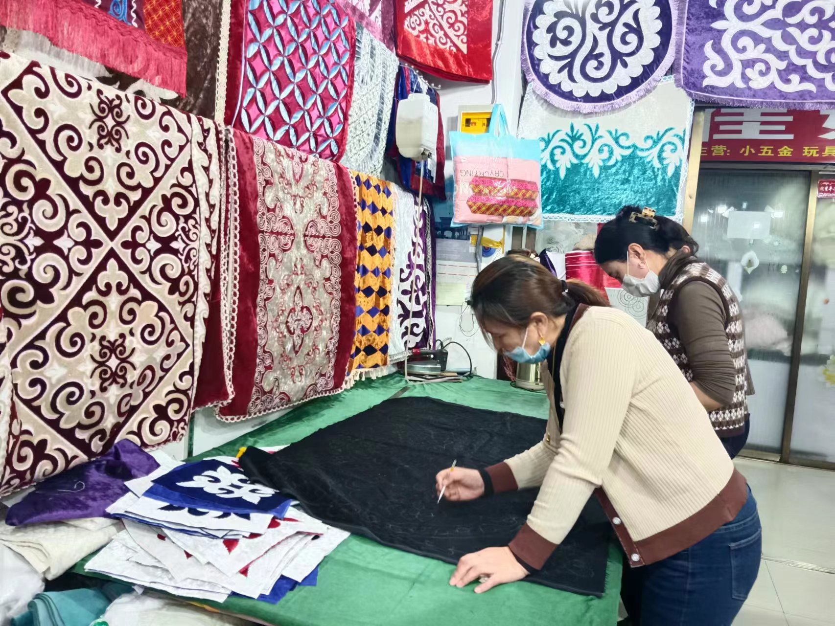 Two women make Kazakh embroidery works at an embroidery shop in Jeminay county, Altay Prefecture, northwest China’s Xinjiang Uygur Autonomous Region, Nov. 21, 2022. (Photo courtesy of the Convergence Media Center of Jeminay county)