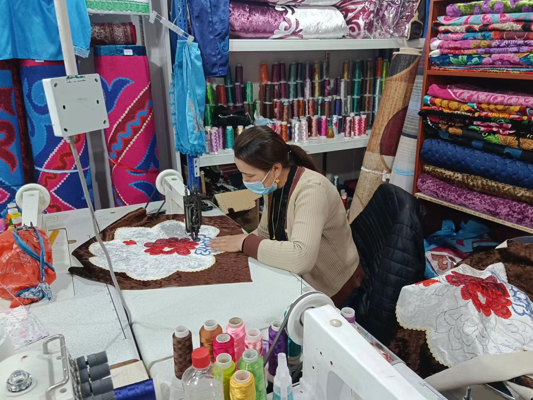 A woman makes a Kazakh embroidery work at an embroidery shop in Jeminay county, Altay Prefecture, northwest China’s Xinjiang Uygur Autonomous Region, Nov. 21, 2022. (Photo courtesy of the Convergence Media Center of Jeminay county)