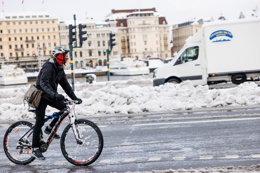 A citizen rides bicycle on a road in Stockholm, Sweden on Nov. 21, 2022. (Photo by Wei Xuechao/Xinhua)
