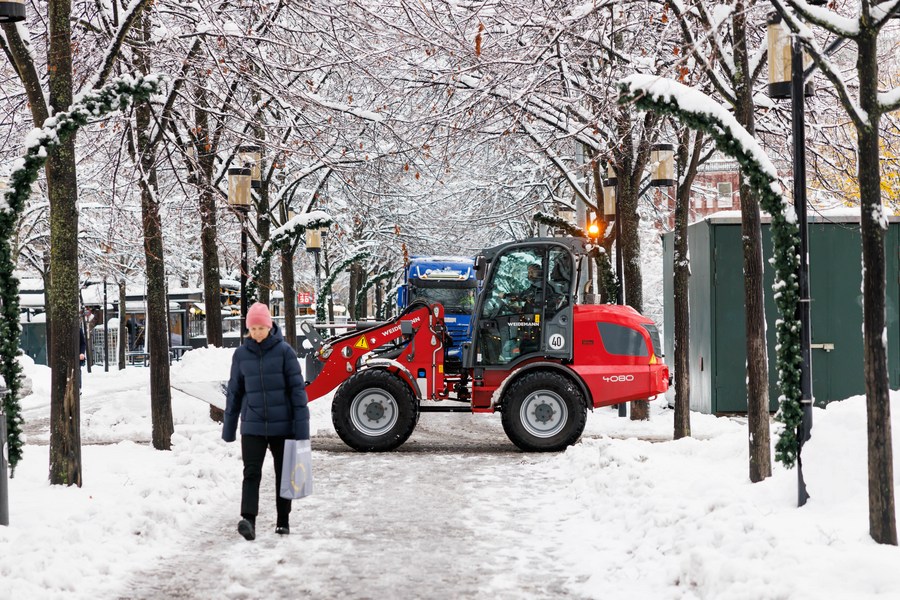 A woman walks on a snowy road as a snowplow clears the road in Stockholm, Sweden on Nov. 21, 2022. (Photo by Wei Xuechao/Xinhua)