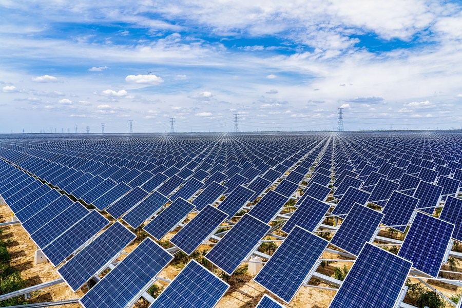 This photo taken on Oct. 18, 2021 shows a view of the Baofeng farming-light integrated photovoltaic power station in northwest China's Ningxia Hui Autonomous Region. (Xinhua)