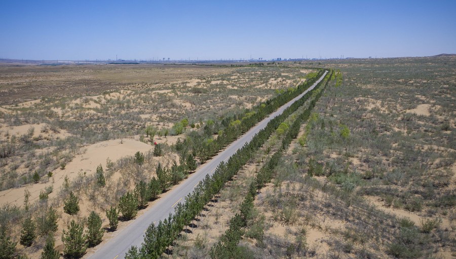 Meanwhile, a green corridor of vibrant vegetation stretches across the southwestern edge of the vast Maowusu Desert in eastern Ningxia.