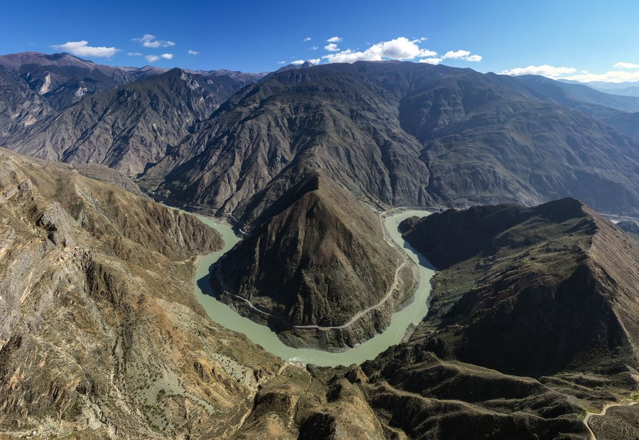 Aerial photo taken on Oct. 27, 2021 shows a bend of the Jinsha River, the upper section of the Yangtze River, in southwest China. (Xinhua/Jiang Wenyao)