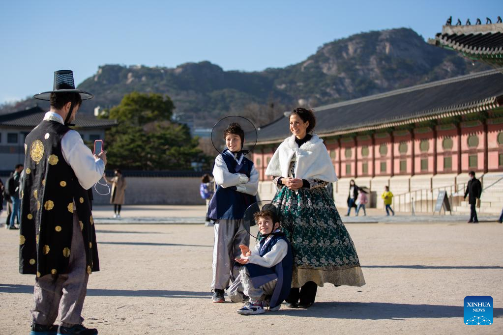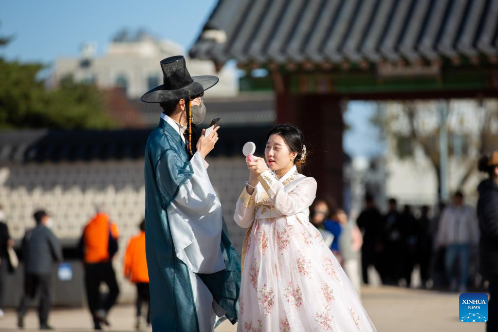 Tourists wearing traditional Hanbok dresses are seen at the Gyeongbokgung Palace in Seoul, South Korea, Nov. 26, 2022. (Xinhua/Wang Yiliang)
