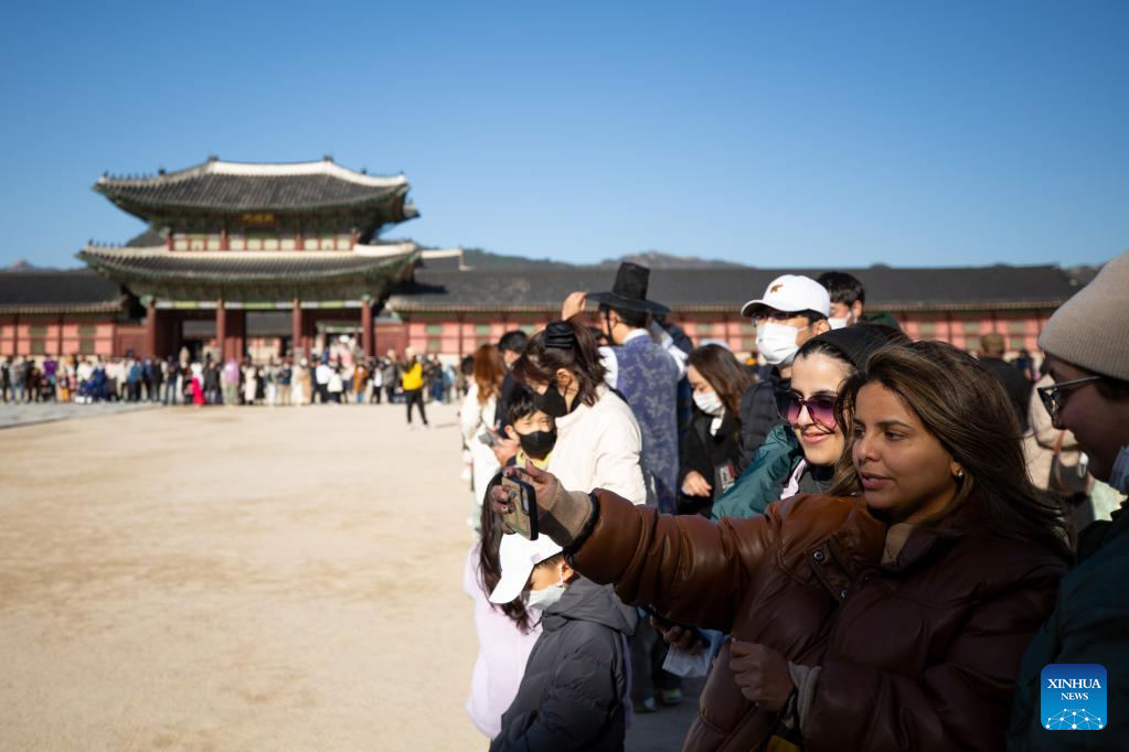 Tourists take photos at the Gyeongbokgung Palace in Seoul, South Korea, Nov. 26, 2022. (Xinhua/Wang Yiliang)