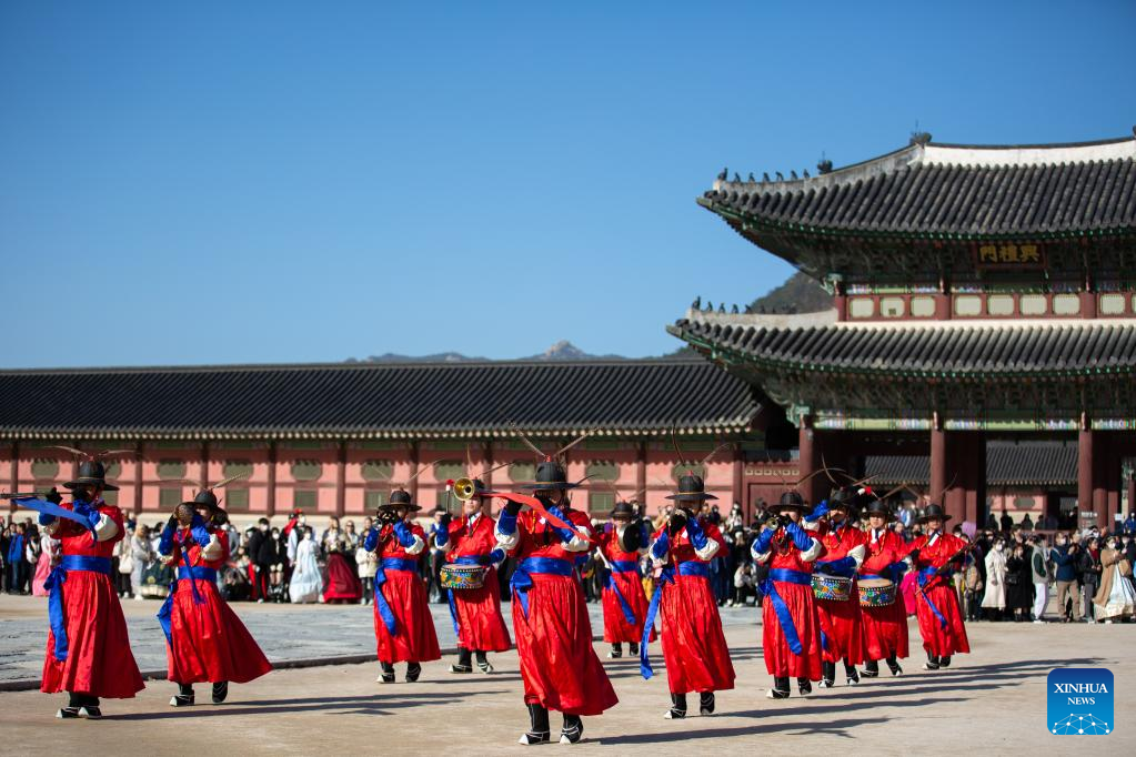 Staff members perform at the Gyeongbokgung Palace in Seoul, South Korea, Nov. 26, 2022. (Xinhua/Wang Yiliang)