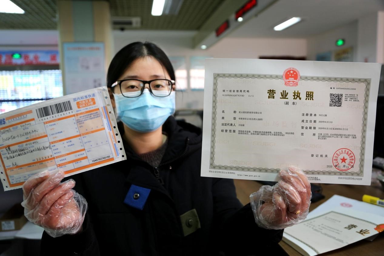 An official with the market regulation bureau of Lianyun district, Lianyungang, east China's Jiangsu province ships a business license to an enterprise that applied for the document online, Feb. 17, 2020. (People's Daily Online/Wang Chun)