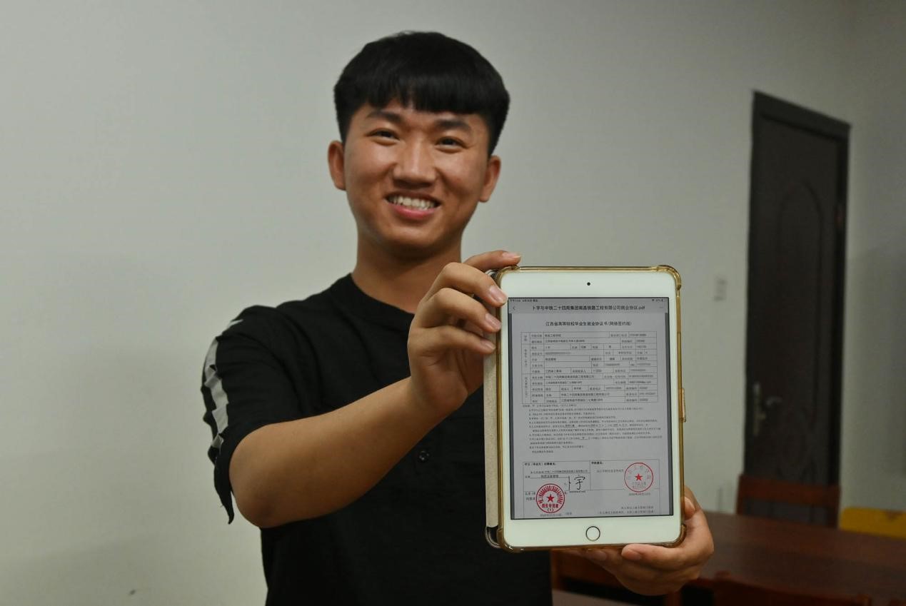 On May 15, 2020, a 2020 graduate of Nanchang Institute of Technology, east China's Jiangxi province, shows an electronic employment contract he signed a day before. The contract is the first electronic employment contract inked in Jiangxi province. (People's Daily Online/Li Jie)