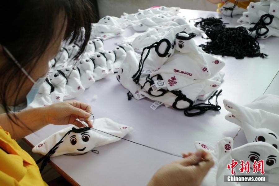A worker handsews a plush toy of Qatar 2022 mascot "La'eeb" at a factory in Dongguan, south China's Guangdong Province, Nov. 26, 2022. (Photo: China News Service/Chen Chuhong)