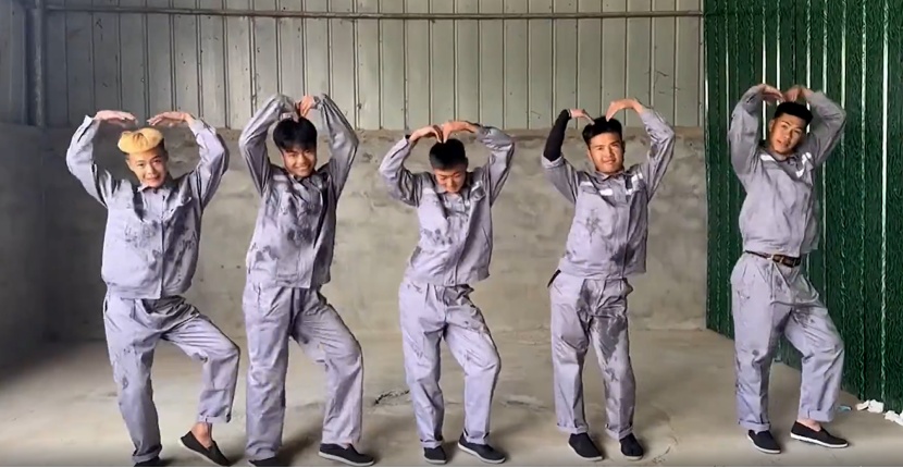 Li Bingyang and his workmates dance in front of the garage where they work. (Photo/CMG China Voice)