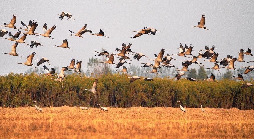 Common cranes fly over a wetland in Yueyang, central China's Hunan province, Nov. 9, 2022. (People's Daily Online/Guo Liliang)