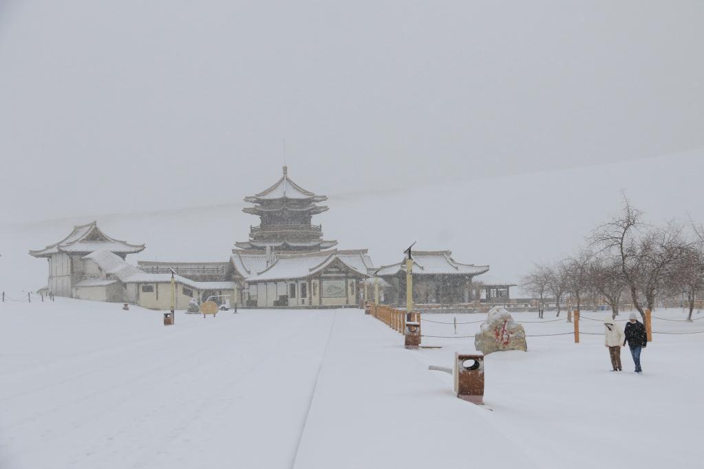 This photo taken on Nov. 27, 2022 shows snow scenery of Mingsha Mountain and Crescent Spring scenic spot in Dunhuang City, northwest China's Gansu Province. (Photo by Zhang Xiaoliang/Xinhua)
