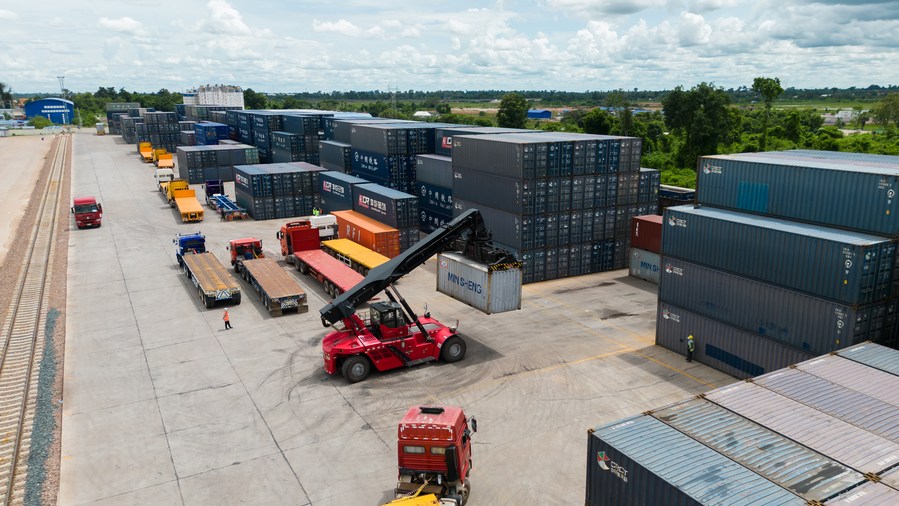 Aerial photo taken on Aug. 9, 2022 shows a crane transporting cross-border goods at Vientiane South Station of China-Laos Railway in Laos. (Photo by Kaikeo Saiyasane/Xinhua)