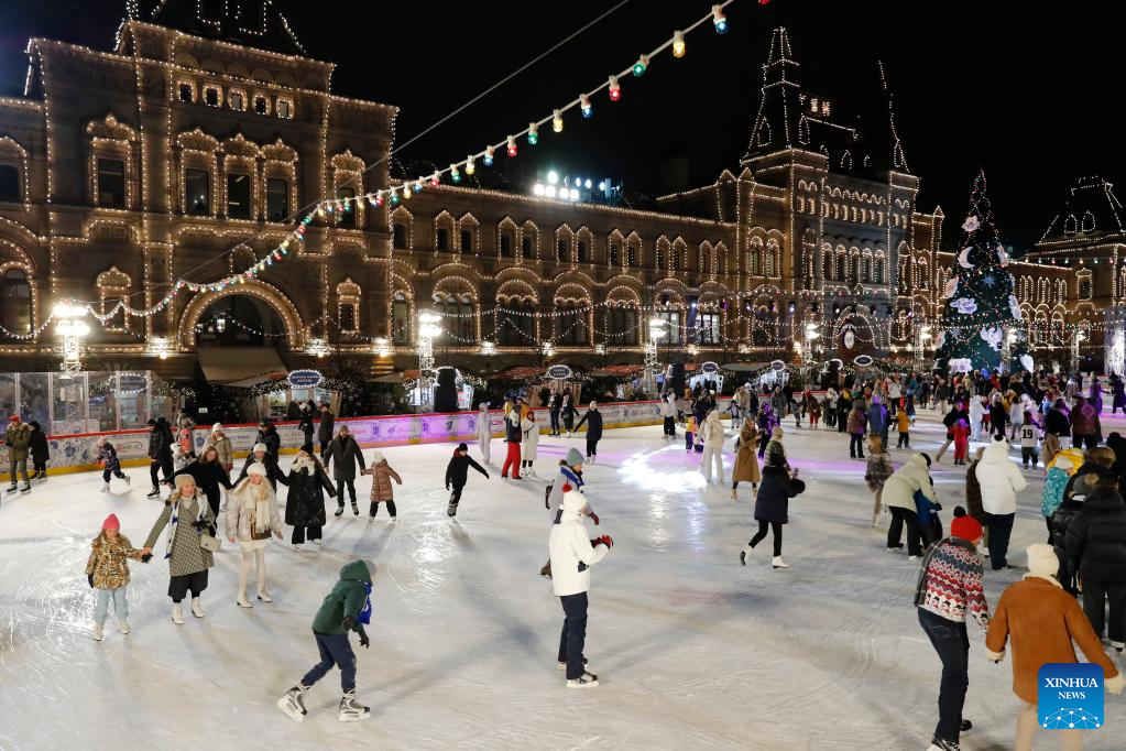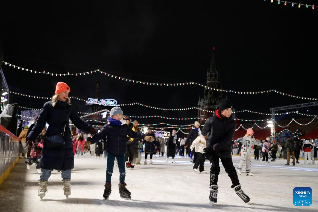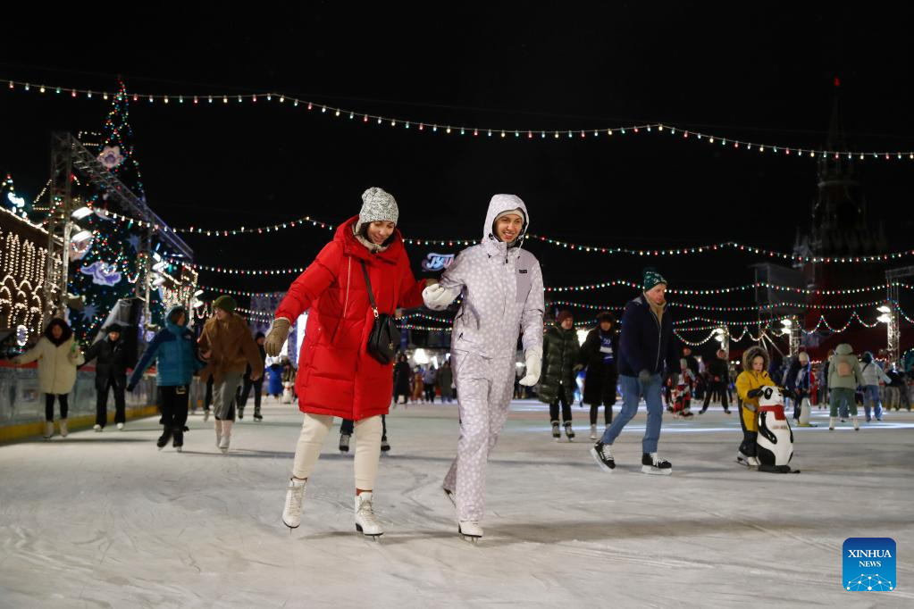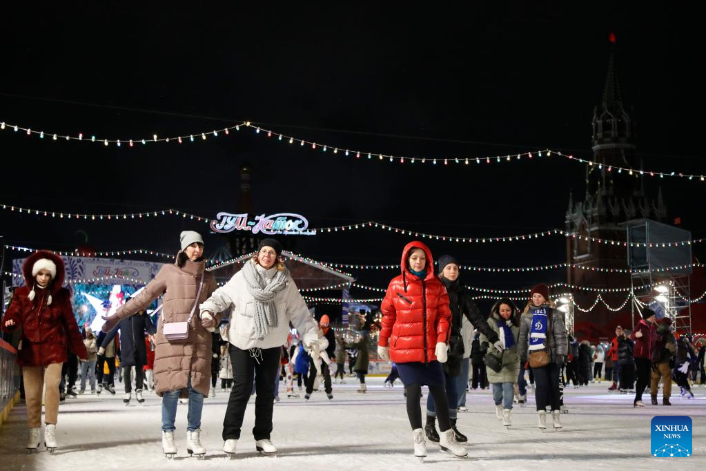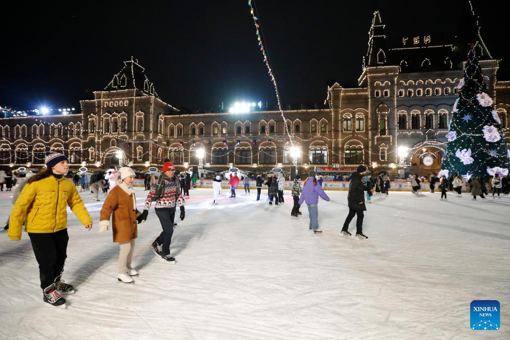 People skate on the GUM ice rink at Red Square in Moscow, Russia, Nov. 28, 2022. (Photo by Alexander Zemlianichenko Jr/Xinhua)