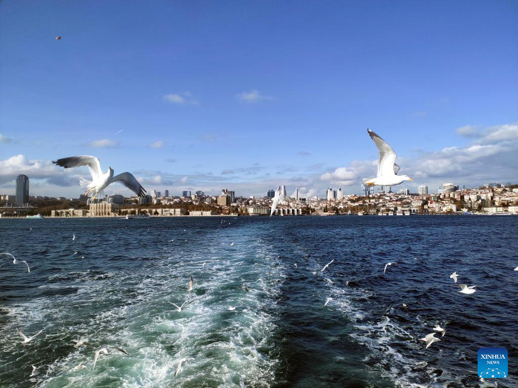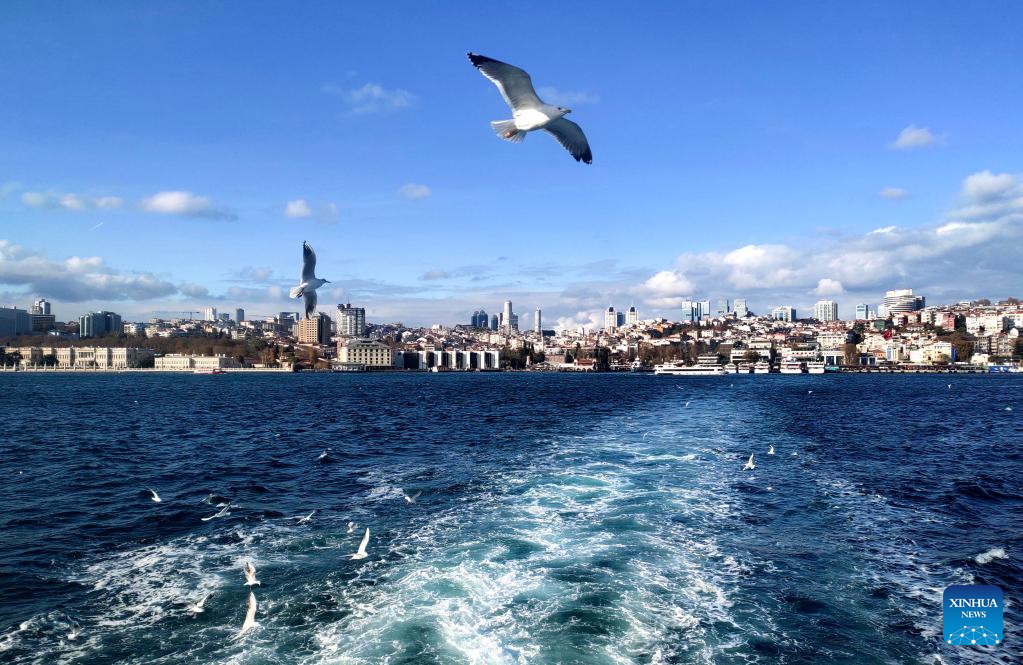 This photo taken on Nov. 27, 2022 shows seagulls flying over the Bosporus Strait in Istanbul, Trkiye. (Xinhua/Shadati)