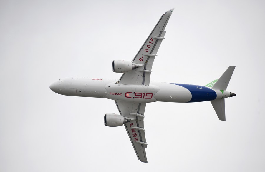 A C919 jet takes part in a flying display at the 14th China International Aviation and Aerospace Exhibition in Zhuhai, south China's Guangdong Province, on Nov. 8, 2022. (Xinhua/Lu Hanxin)