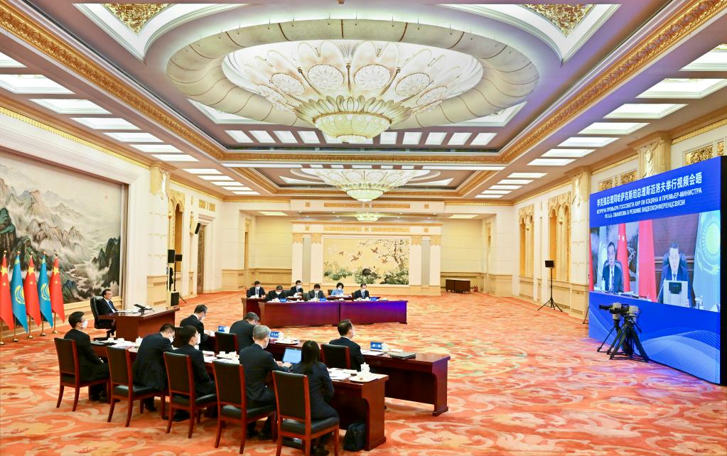 Chinese Premier Li Keqiang meets with Kazakh Prime Minister Alikhan Smailov via video link at the Great Hall of the People in Beijing, capital of China, Nov. 29, 2022. (Xinhua/Yue Yuewei)