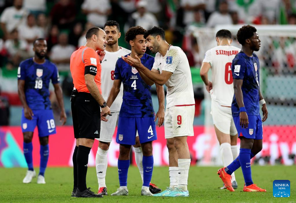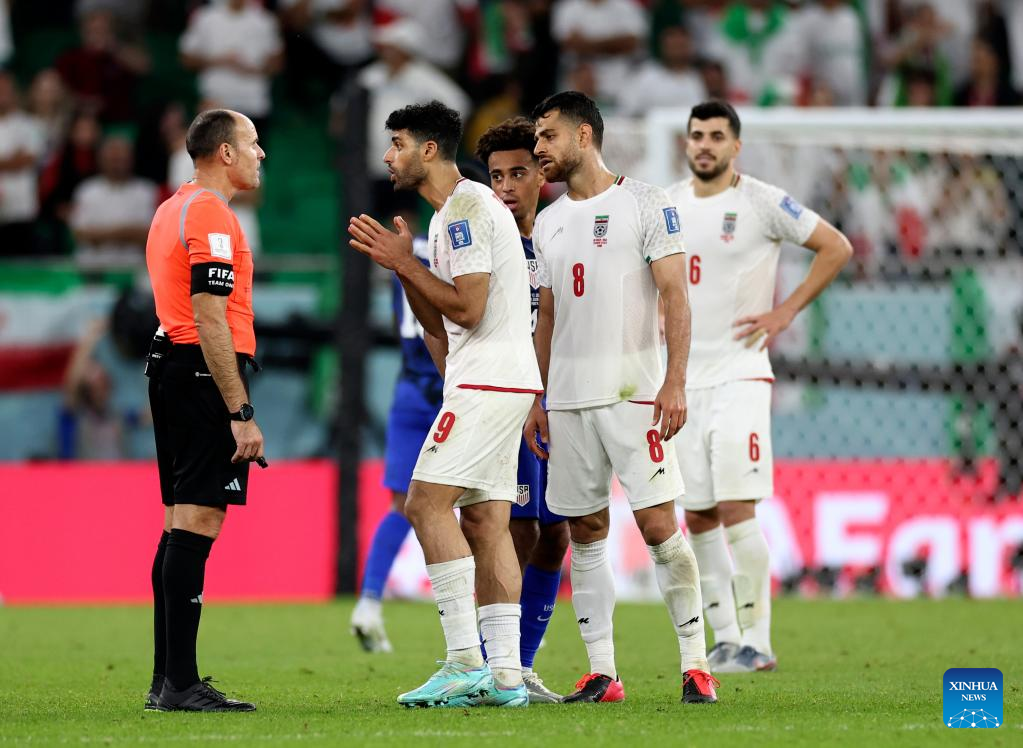 Mehdi Taremi (2nd L) of Iran and his teammates argue with referee Antonio Mateu Lahoz during the Group B match between Iran and the United States at the 2022 FIFA World Cup at Al Thumama Stadium in Doha, Qatar, Nov. 29, 2022. (Xinhua/Xu Zijian)