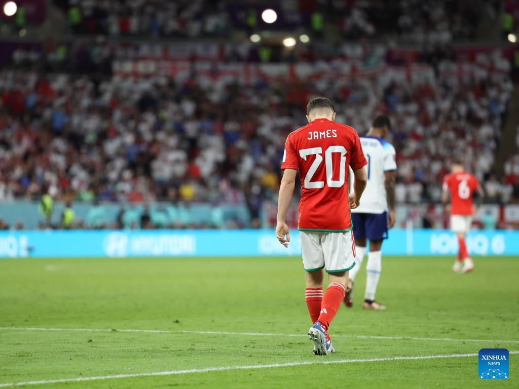 Daniel James (Front) of Wales during the Group B match between Wales and England at the 2022 FIFA World Cup at Ahmad Bin Ali Stadium in Al Rayyan, Qatar, Nov. 29, 2022. (Xinhua/Li Ming)