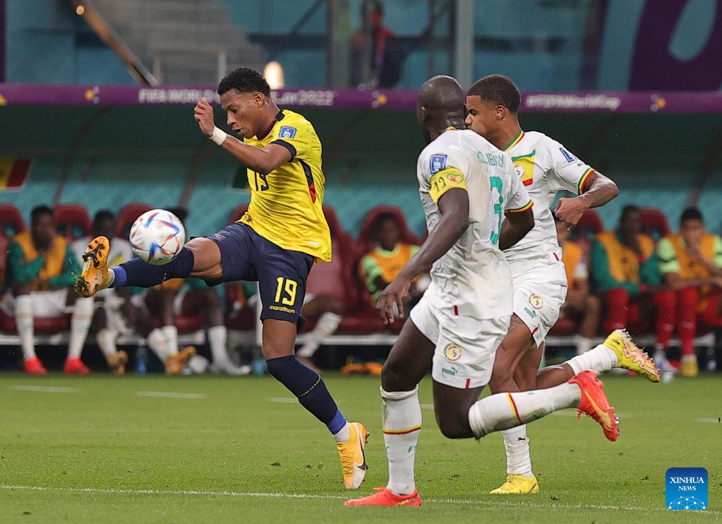 Gonzalo Plata (L) of Ecuador competes during the Group A match between Ecuador and Senegal at the 2022 FIFA World Cup at Khalifa International Stadium in Doha, Qatar, Nov. 29, 2022. (Xinhua/Wang Dongzhen)
