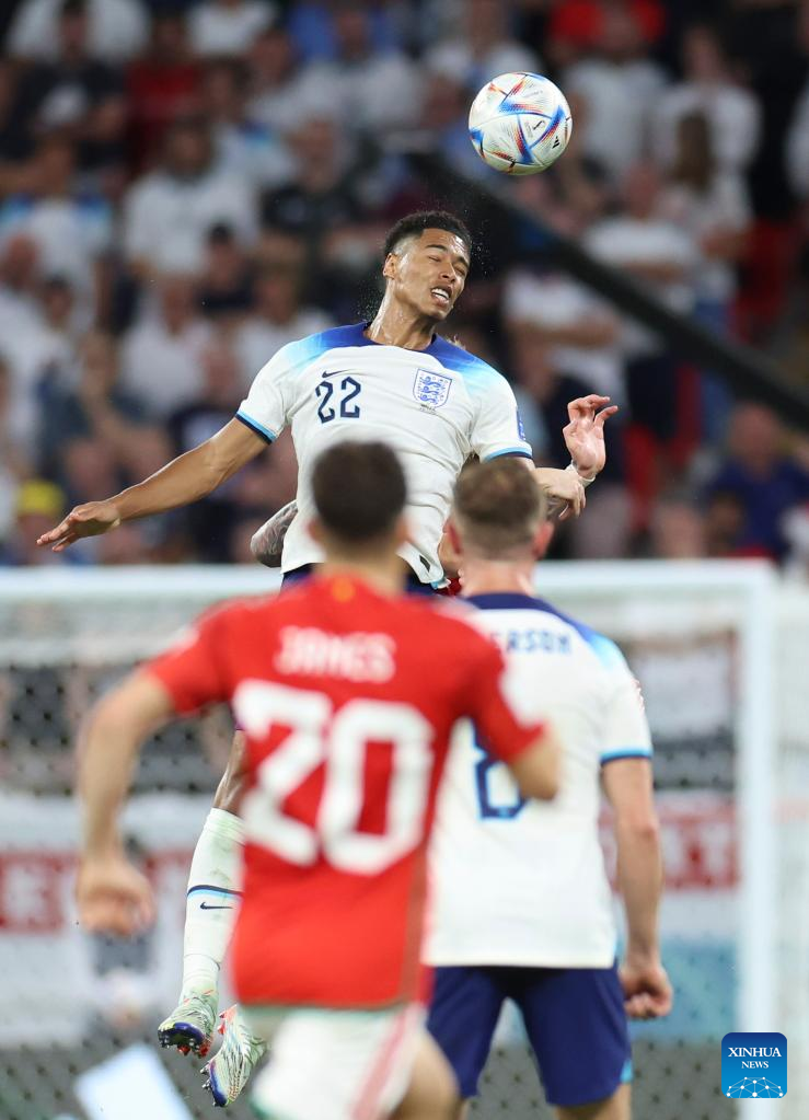 Jude Bellingham (Top) of England heads the ball during the Group B match between Wales and England at the 2022 FIFA World Cup at Ahmad Bin Ali Stadium in Al Rayyan, Qatar, Nov. 29, 2022. (Xinhua/Li Ming)