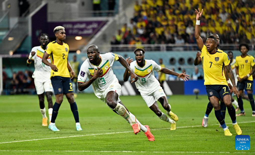 Kalidou Koulibaly (3rd L) of Senegal celebrates scoring during the Group A match between Ecuador and Senegal at the 2022 FIFA World Cup at Khalifa International Stadium in Doha, Qatar, Nov. 29, 2022. (Xinhua/Xin Yuewei)
