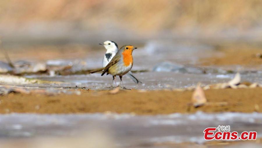 A rare robin bird rests on the lake side in Mangya city, northwest China's Qinghai Province. (Photo: China News Service/Wang Xiaojiong)