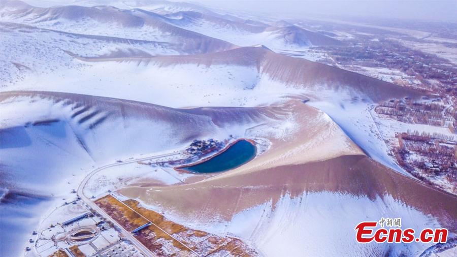 Snow scenery of Mingsha Mountain and Crescent Spring scenic spot in Dunhuang City, northwest China's Gansu Province, Nov. 27, 2022. Dunhuang embraced its first snow of this winter on Sunday. (Photo: China News Servie/Wang Binyin)