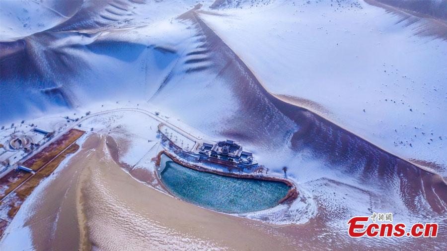 Snow scenery of Mingsha Mountain and Crescent Spring scenic spot in Dunhuang City, northwest China's Gansu Province, Nov. 27, 2022. Dunhuang embraced its first snow of this winter on Sunday. (Photo: China News Servie/Wang Binyin)