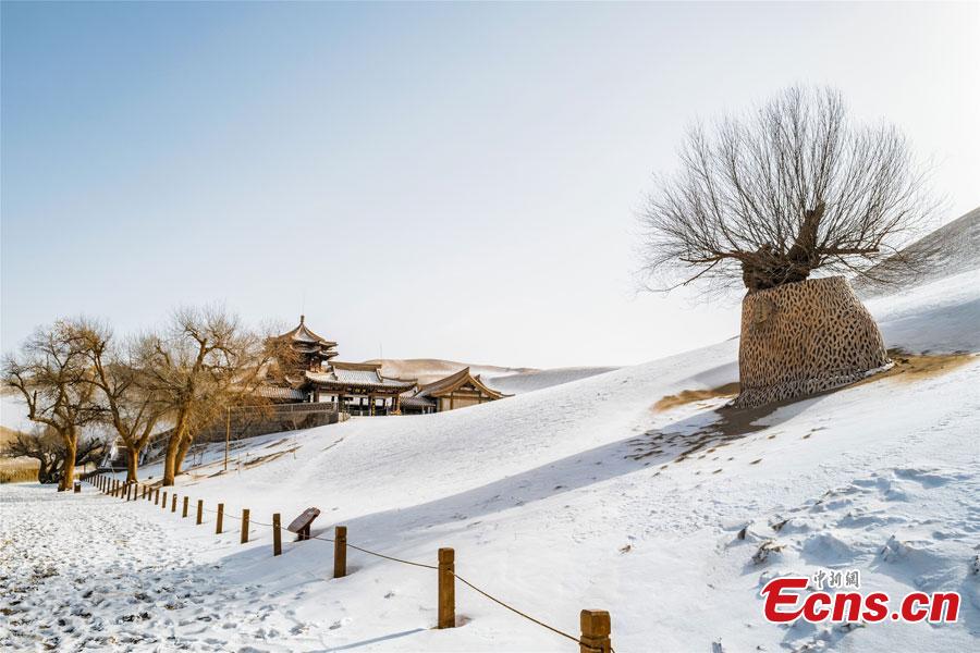 Snow scenery of Mingsha Mountain and Crescent Spring scenic spot in Dunhuang City, northwest China's Gansu Province, Nov. 27, 2022. Dunhuang embraced its first snow of this winter on Sunday. (Photo: China News Servie/Wang Binyin)