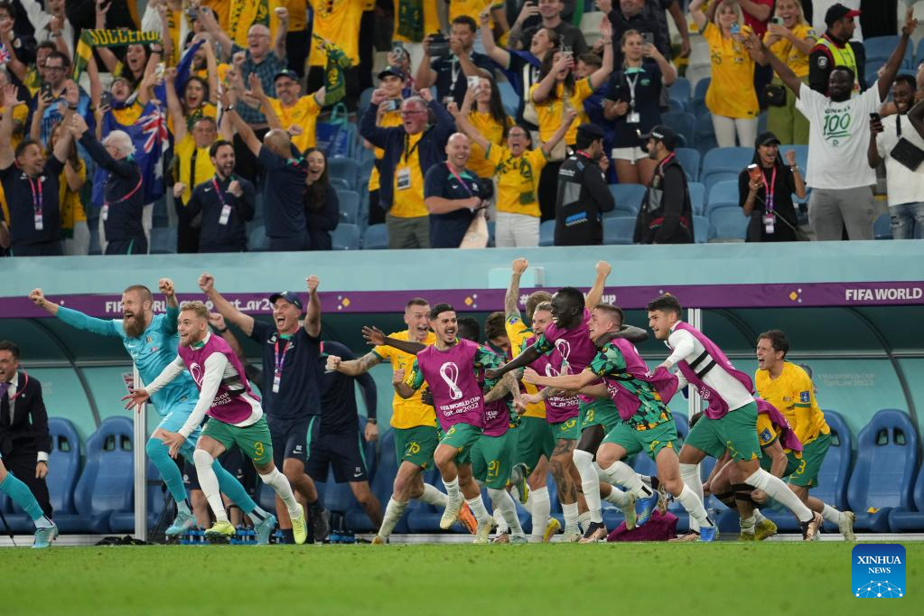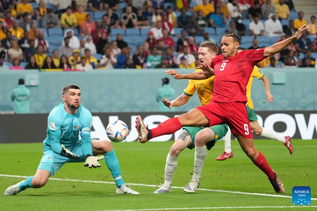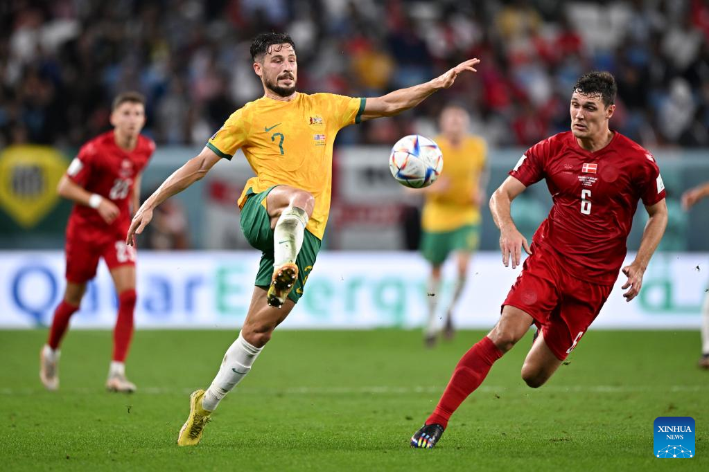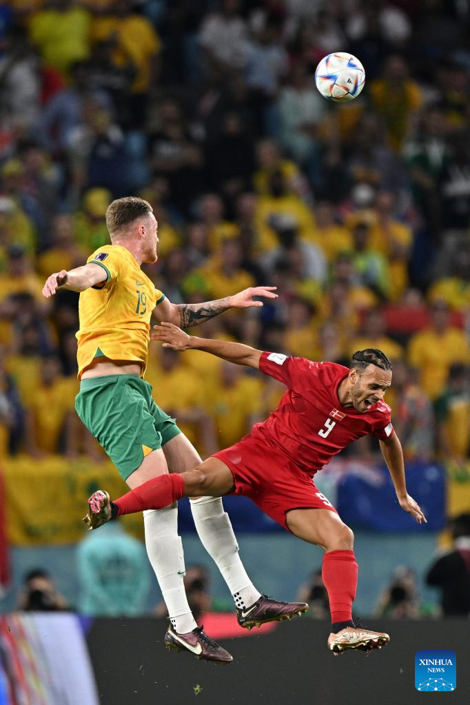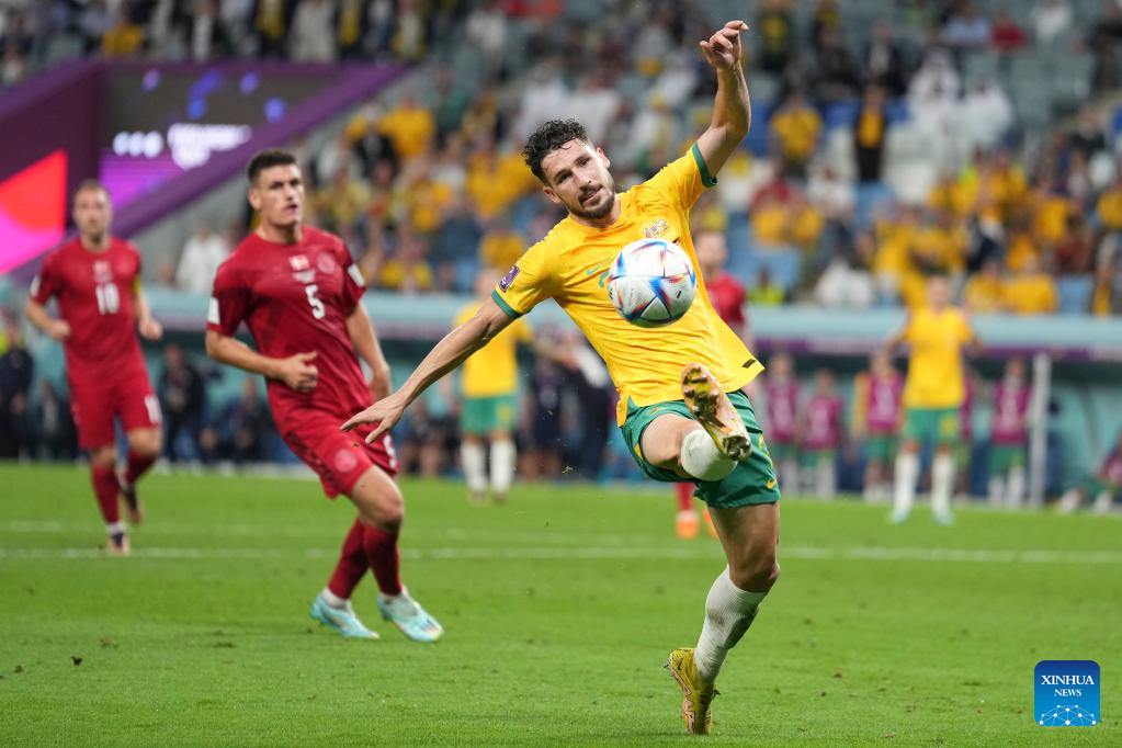 DOHA, Nov. 30 (Xinhua) -- Mathew Leckie scored a superb second-half goal as Australia beat Denmark 1-0 on Wednesday to reach the round of 16 at the FIFA World Cup.