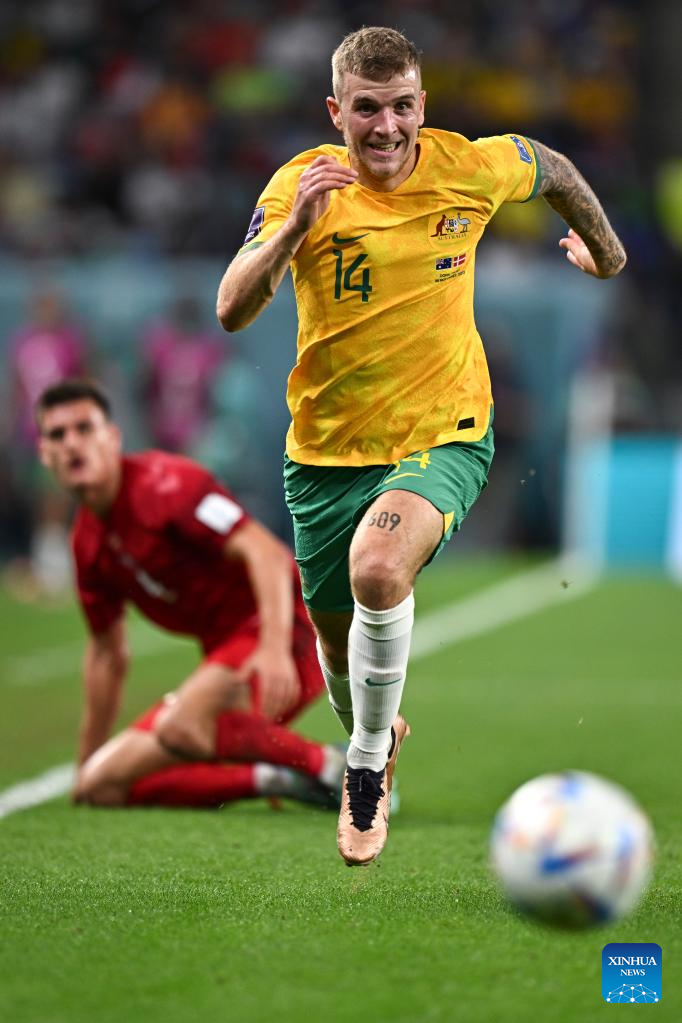Riley McGree (Front) of Australia competes during the Group D match between Australia and Denmark at the 2022 FIFA World Cup at Al Janoub Stadium in Al Wakrah, Qatar, Nov. 30, 2022. (Xinhua/Xin Yuewei)