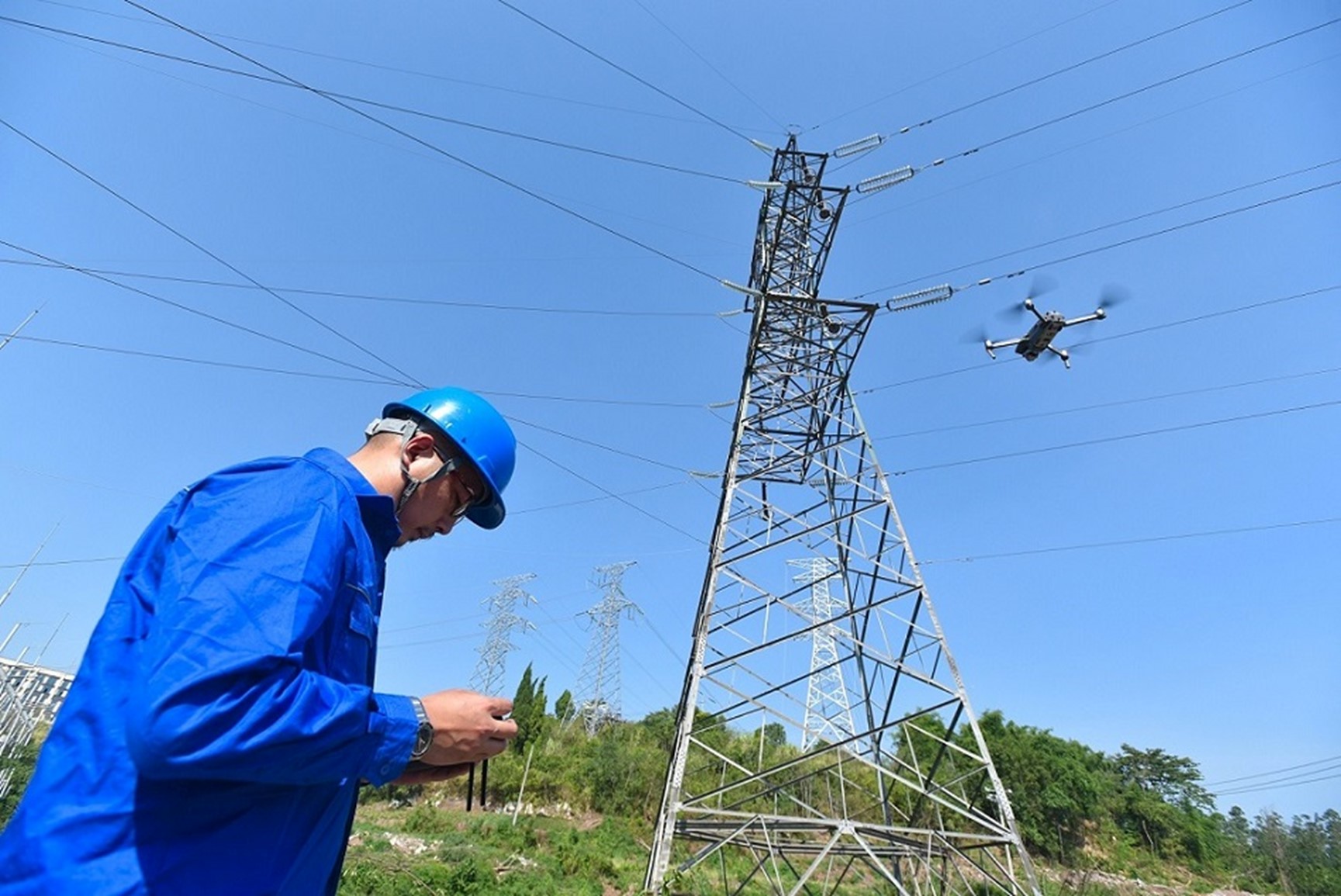 A staff member of the Neijiang Power Supply Company of the State Grid operates a drone to inspect transmission lines in Neijiang, southwest China's Sichuan province, August 2022. (People's Daily Online/Huang Zhenghua)