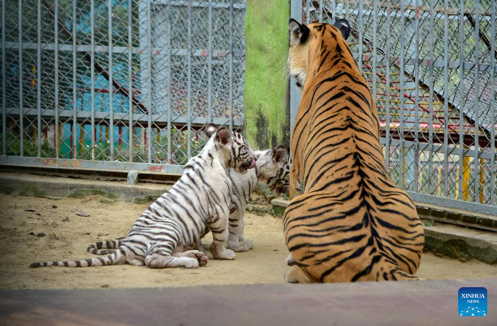 White tiger cubs are seen with their mother in Chattogram Zoo in Chattogram, Bangladesh on Nov. 27, 2022. Four white tiger cubs were born at Chattogram Zoo in July. (Xinhua)